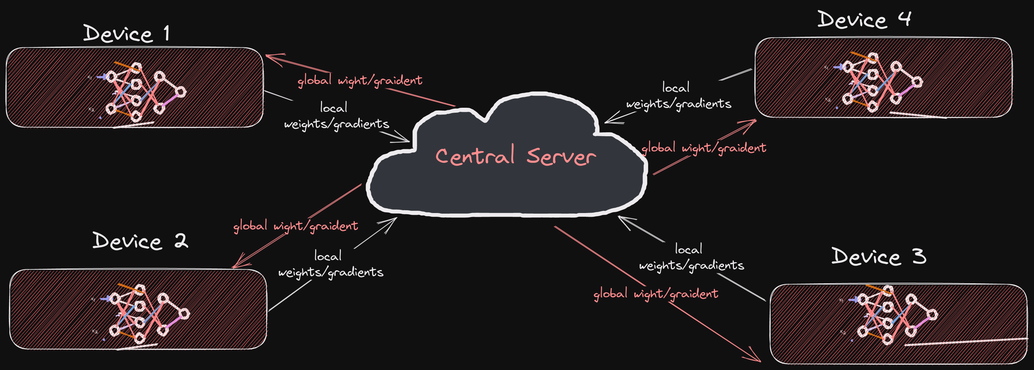 - A bunch of devices (clients) train a model locally using their own data.